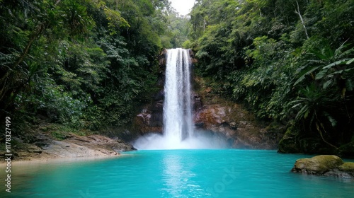 Fototapeta premium Serene waterfall cascading into a turquoise pool surrounded by lush greenery.
