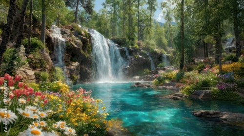 © Ana, Obraz premium Serene waterfall cascading into a turquoise pool, surrounded by vibrant flowers and lush trees