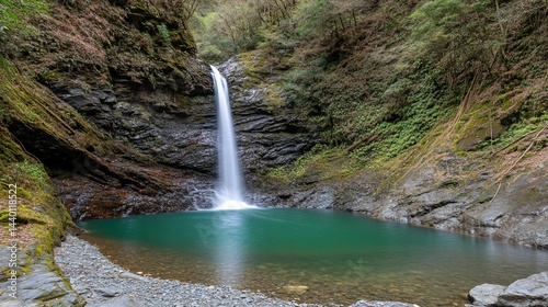 Naklejka premium Serene waterfall cascading into a vibrant green pool, nestled within lush forest