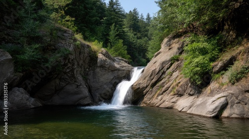 Obraz premium Serene Waterfall Cascading into Crystal Clear Pool Surrounded by Lush Greenery and Rocky Outcrops in Tranquil Forest Setting