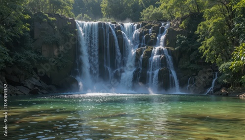© Kitta Studio, Fototapeta premium Serene Waterfall Cascading into Crystal Clear Pool Surrounded by Trees