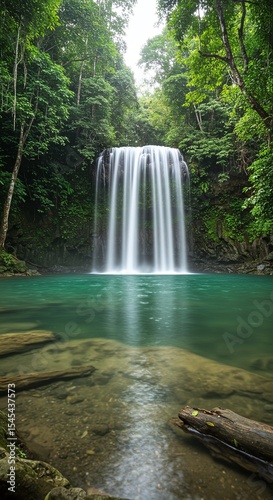 Fototapeta premium Serene Waterfall Cascading into Emerald Pool Lush Rainforest Paradise