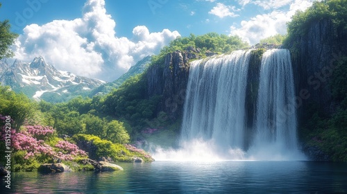 © Ali, Fototapeta premium Serene waterfall cascading into tranquil lake, mountains.