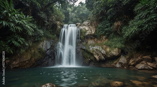 Fototapeta premium Serene waterfall cascading into tranquil pool amidst lush greenery in a...