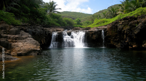 © Arumboy, Fototapeta premium serene waterfall cascading into tranquil pool surrounded by lush greenery