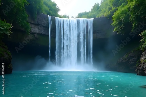 © misster, Fototapeta premium Serene Waterfall Cascading Into Tranquil Turquoise Pool Surrounded By Lush Green Foliage