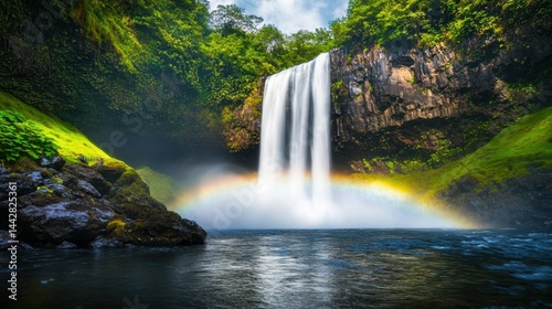 Fototapeta premium Serene Waterfall Cascading Into Vibrant Pool Under Bright Rainbow