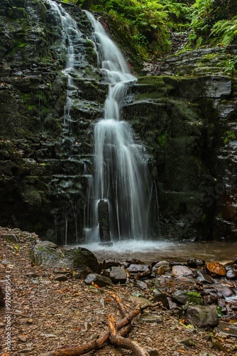 Fototapeta premium Serene waterfall cascading over moss-covered rocks in a lush forest setting