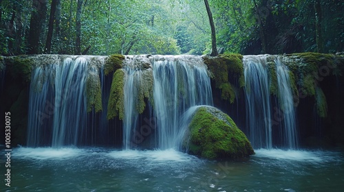 © bcendet, Fototapeta premium Serene waterfall cascading over moss-covered rocks in a lush green forest.