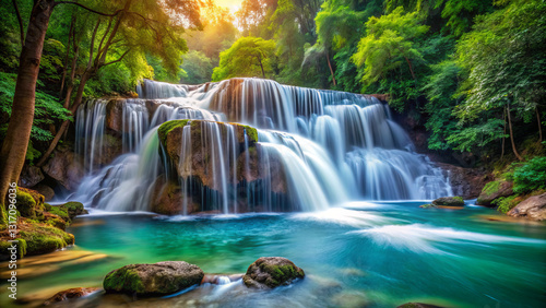 © phai, Obraz premium serene waterfall cascading over rocks into tranquil pool, surrounded by lush greenery