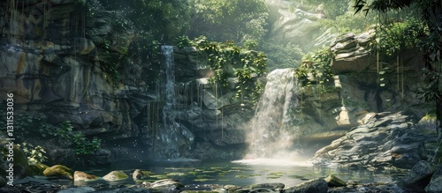Fototapeta premium Serene waterfall cascading over rugged rocks surrounded by lush greenery...