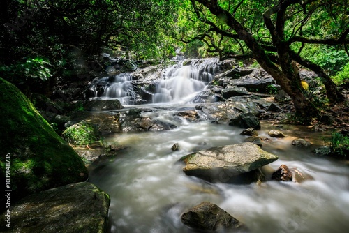 Fototapeta premium Serene Waterfall Cascading Over Smooth Rocks in Nature, Little Hawaii Falls,...