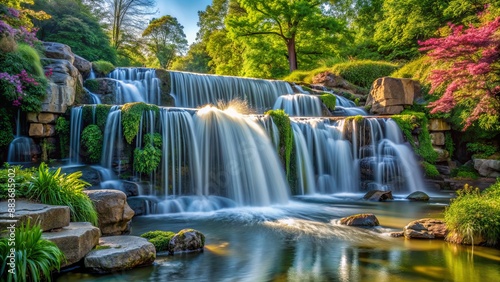 Obraz premium Serene Waterfall Cascading Through Lush Greenery, Long Exposure, Vibrant...
