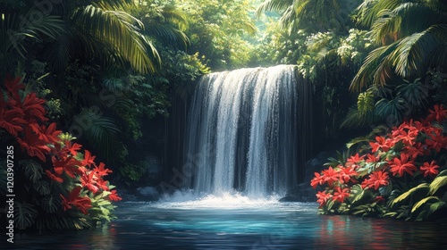 © Kaizenart, Obraz premium Serene waterfall cascading through lush tropical foliage, surrounded by vibrant flowers and tranquil pool