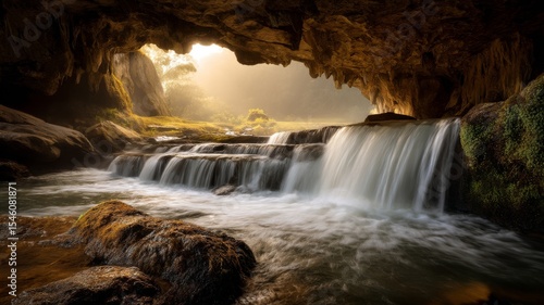 © Ekkarat_Studio, Fototapeta premium Serene Waterfall Cascading Through Rocky Cave in a Lush Green Forest, Bathed in Warm Sunlight
