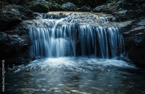 © ANUAR, Fototapeta premium Serene Waterfall Flowing Gently Over Rocks in a Peaceful Forest Setting Surrounded by Lush Greenery and Natural Beauty in Soft Light