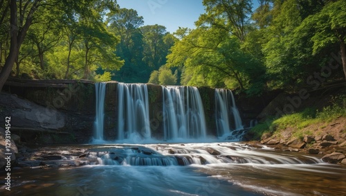 © GenZGraphics, Obraz premium Serene Waterfall Flowing Through Lush Greenery Captured with Long Exposure on a Sunny Summer Day