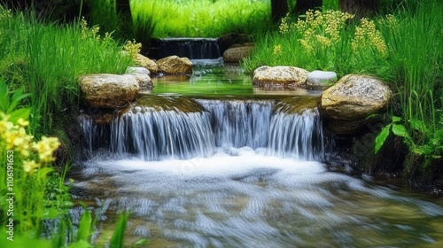 Naklejka premium Serene Waterfall Flows Through Lush Green Landscape