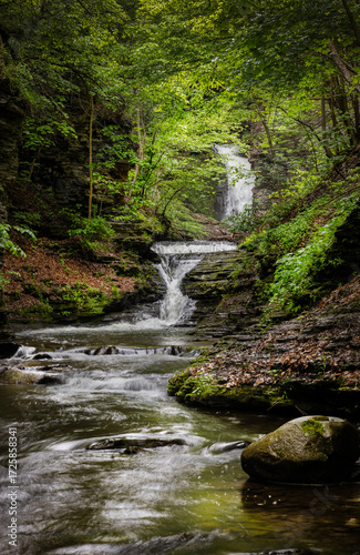 Fototapeta premium Serene Waterfall in a Lush Green Forest Setting