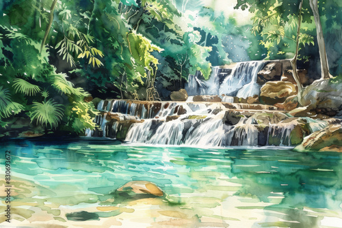 Naklejka premium Serene Waterfall in Lush Forest Captured in Stunning Watercolor Art
