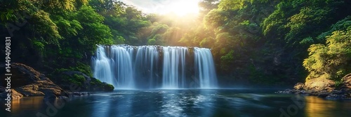 Fototapeta premium Serene Waterfall In Lush Green Forest Landscape Scenery With Sunlight...