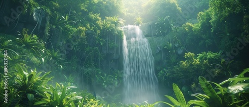 © Starkreal, Fototapeta premium Serene Waterfall in Lush Tropical Jungle Landscape