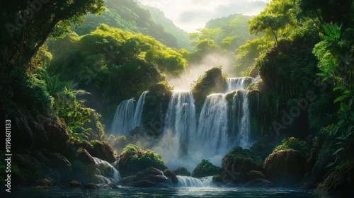 © muhammad, Fototapeta premium Serene Waterfall in Lush Tropical Paradise