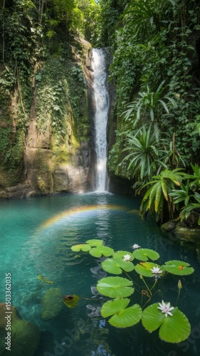Naklejka premium Serene Waterfall in Lush Tropical Rainforest with Water Lilies