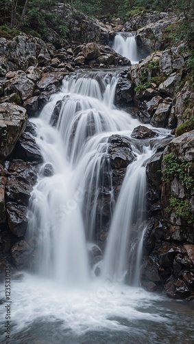 © GMeta, Obraz premium Serene waterfall in motion blur over rocky terrain