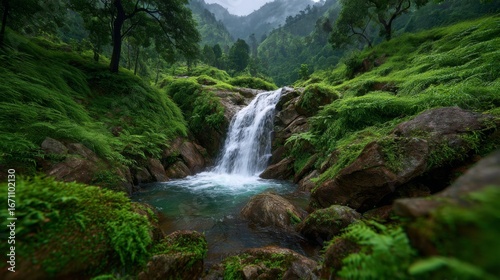 © KP, Naklejka premium Serene Waterfall in Verdant Landscape: A pristine waterfall cascades gracefully amidst a lush, vibrant green landscape, creating a tranquil and awe-inspiring scene.