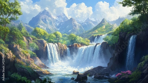 Fototapeta premium Serene Waterfall Landscape with Lush Greenery and Majestic Mountains