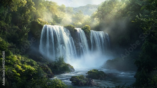 © nuyirdna, Fototapeta premium Serene Waterfall: Lush Tropical Paradise, Misty Sunlight, Dreamlike Art