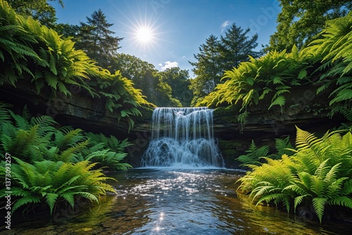 © Michael, Fototapeta premium Serene Waterfall Nestled in Vibrant Ferns and Clear Blue Summer Sky