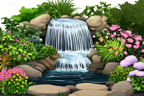© masud, Obraz premium Serene Waterfall Oasis: Lush Floral Garden and Cascading Water Feature