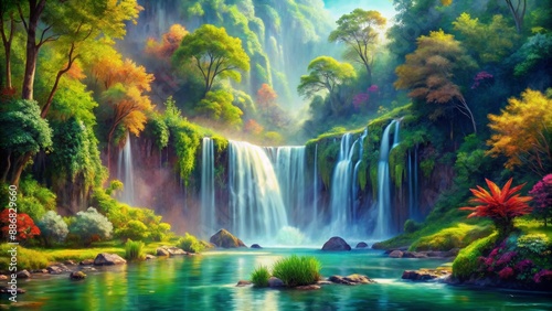 Obraz premium Serene Waterfall Oasis Lush Green Forest, Tranquil Water, Sunbeams, Digital Painting, Waterfall, Nature, Landscape