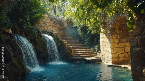 Fototapeta premium Serene Waterfall Oasis Steps Garden