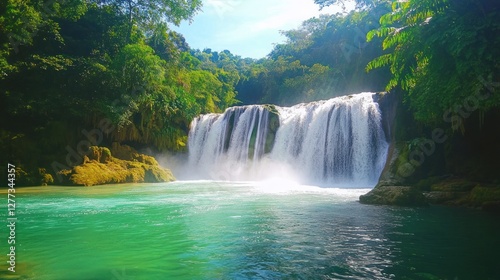 © Alfanachmad, Naklejka premium Serene Waterfall Paradise: Lush Tropical Greens and Crystal Clear Water