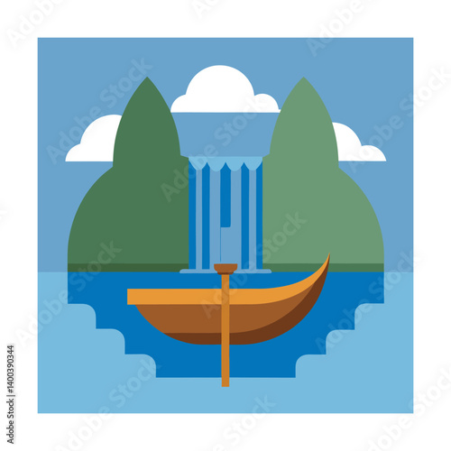 Naklejka premium Serene Waterfall Scene with Gondola on a Peaceful Lake