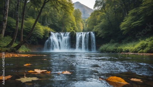 © TheWaterMeloonProjec, Obraz premium Serene waterfall surrounded by dense trees