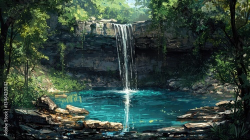 © Kitta Studio, Naklejka premium Serene Waterfall Surrounded by Lush Greenery in a Tranquil Forest