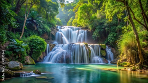 Obraz premium Serene waterfall surrounded by lush jungle vegetation in Northern Thailand,...