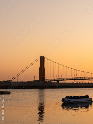 Obraz premium serene waterfront sunset with boats drifting under warm golden light