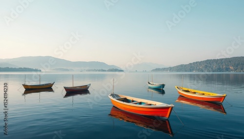 © Chalisa, Naklejka premium Serene Waters Colorful Boats at Rest on a Calm Lake at Dawn