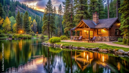 © Caitlin, Fototapeta premium Serene waterside cabin nestled among trees on Lake Avery's shore in Missoula, Montana, featuring outdoor seating area, crackling fireplace, and nearby stream flowing into lake banks.