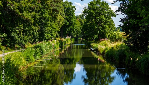 © Parkik, Fototapeta premium Serene waterway with lush green foliage and a small arched bridge reflected in the calm water. The scene is bathed in sunlight, suggesting a peaceful and tranquil environment, ideal for a stroll