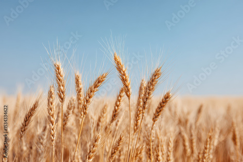 Fototapeta premium serene wheat field under clear blue sky with golden stalks swaying gently in...