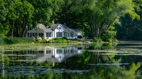 Fototapeta premium Serene white dwelling nestled beside lush waterfront foliage reflecting upon...