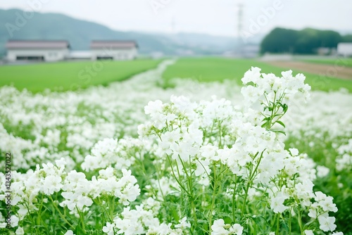 © senyumanmu, Obraz premium Serene White Flowers Field Green Landscape Rural Scenery