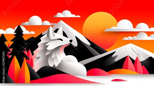 © hanjawara, Fototapeta premium Serene White Fox in Paper Art Mountain Landscape at Sunset