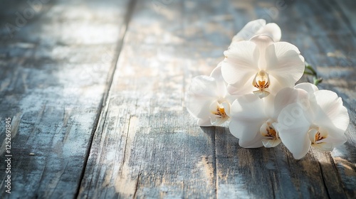 Fototapeta premium Serene White Orchids on Rustic Wooden Surface: A Study in Tranquility and...